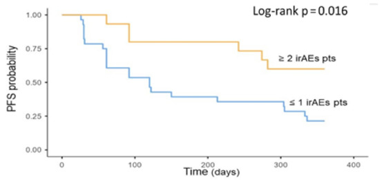 However, to identify a relationship between AE and treatment response, it is important to consider AE classes individually. Although all patients experiencing irAEs of any class exhibited more favorable outcomes, only patients with thyroid dysfunction and cutaneous toxicity demonstrated significantly higher PFS.