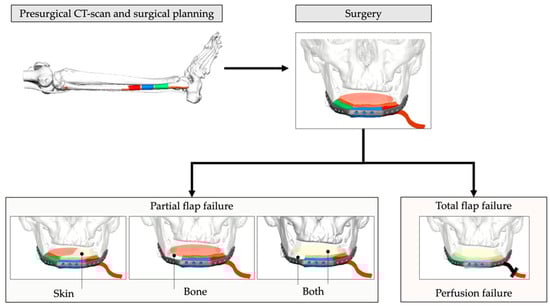 The study was conducted as a monocentric, retrospective study. Medical records of all patients who underwent FFF in the head and neck region from January 2002 to June 2020 were analyzed in respect of success of the flap transfer procedure. Flap failure was stratified into two groups: partial flap failure (PFF) and total flap failure (TFF) (Figure 1). PFF was defined as any loss of parts of the skin paddle (Skin) (Figure 2), parts or segments (poly-segmental reconstruction) of bone grafts (Bone) (Figure 3), or a combination of both (Both). The major characteristic of PFF is the remaining blood supply by the vascular pedicle. In contrast to PFF, TFF is characterized by discontinued perfusion of the graft (i.e., thrombosis). Intra- or extraoral wound dehiscences around the skin paddle alone did not match the criteria for PFF and were not included.