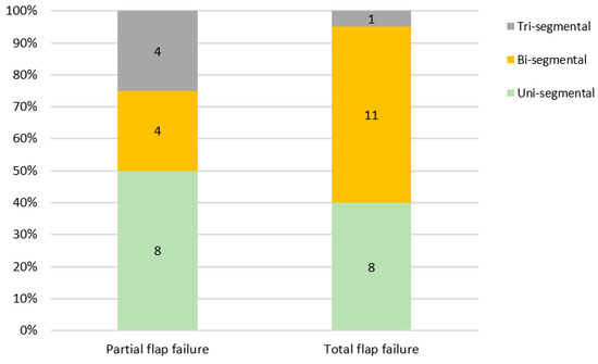 TFF was observed mostly in Brown class I (n = 7) and II (n = 6) defects. Subtotal loss of the skin paddle was incident in 68.7% of cases (n = 11 out of 16). Isolated loss of fibular bone segments was found in 25.0% (n = 4) and a combination of both was reported in only one case (6.3%). PFF was found in 50.0% (8 out of 16 cases) of uni-segmental, 25.0% (n = 4) of bi-segmental, and 25.0% (n = 4) of tri-segmental jaw reconstructions. A total flap loss occurred in 55.0% of cases after bi-segmental and in 40.0% of cases after uni-segmental reconstructions (Figure 7). There was a non-significant trend towards TFF in poly-segmental reconstructions (p = 0.114).