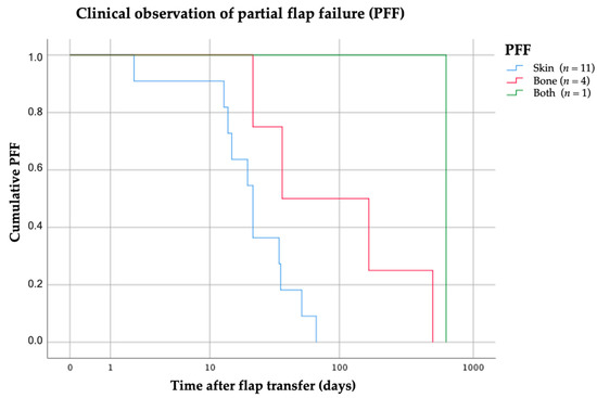 A total loss of the skin paddle (n = 11) was observed at a mean of 27 days (median 22 days, range 2–67 days) and an isolated loss of bone graft segments at 181 days (n = 4; median: 101.5 days, range 37–499 days) post surgery. Kaplan–Meier survival function was calculated and visualizes the different periods of partial soft and hard tissue failure (Figure 8).