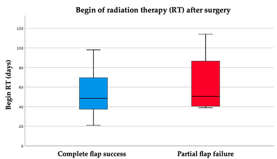 In comparison to the beginning of radiation therapy in the complete success group (n = 40, mean 52.9 days, median 49 days, range 21–98 days), PFF of the skin paddle generates a delay (Figure 9). Radiation therapy started at a mean of 63.5 days (n = 4, median 50.5 days, range 39–114 days). The difference remains without any statistical significance (p = 0.358).