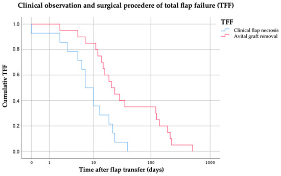 TFF concerning the first clinical signs of flap necrosis and time of removal of the avital graft was visualized by Kaplan–Meier function. The abscissa axis “time” (days) is drawn on a logarithmic scale.