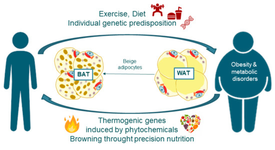The most straightforward way to prevent obesity is to limit calorie intake or to increase the burning of calories through exercise and physical activity. However, majority of subjects fail in their attempts to accomplish these aims. Thus, at present, the only method to combat excessive obesity is through surgery, as many drugs have failed causing serious and deleterious side effects. Nonetheless, it is an invasive method not available for all patients which also requires long time of recovery. Therefore, it has gained importance to investigate in complementary approaches in the frame of Precision Nutrition to alleviate obesity and associated metabolic alterations (Figure 1). As AT contributes to the control of the systemic energetic balance, strategies to increase the thermogenic potential of AT to augment the energetic expenditure (EE) may be relevant in the control of metabolic alterations. In this regard, the crosstalk between adipose tissue with other metabolic organs such as skeletal muscle is another complementary strategy to be explored [4,5,6,7,8,9,10,11,12,13,14,15].