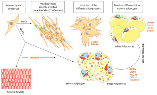 Nevertheless, WAT and BAT are formed by different mesenchymal progenitors, with BAT cells coming from progenitors common to the skeletal muscle tissue which are positive for myogenic factor 5 (Myf5), whereas WAT cells come from progenitors lacking this factor. Hence, as we show in Figure 2, two different types of mesenchymal precursors give rise to two different types of AT that can be find in the body. Importantly, adipogenesis is controlled by distinct transcription factors and proteins to determine the fate of preadipocytes to WAT or BAT. For instance, PR domain containing 16 (PRDM16), Peroxisome Proliferator Activated Receptor Gamma Coactivator 1 Alpha (PGC1a), Carnitine Palmitoyltransferase 1A (CPT1a) and UCP1 are key factors promoting BAT adipogenesis and differentiation with increased mitochondrial biogenesis and fatty acid oxidation capacity. On the other hand, Peroxisome Proliferator Activated Receptor Gamma (PPARG), CCAAT Enhancer Binding Protein Alpha (C/EBPα), Sterol Regulatory Element Binding Transcription Factor 1 (SREBP1) and Fatty Acid Binding Protein 4 (FABP4) are implicated in WAT differentiation and lipid storage. Importantly, adipogenesis have been demonstrated to be modulated by external inductors such as cold exposure or nutritional agents [37,40,41].
