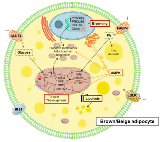 Main mediators implicated of browning and thermogenesis in brown/beige adipocytes.