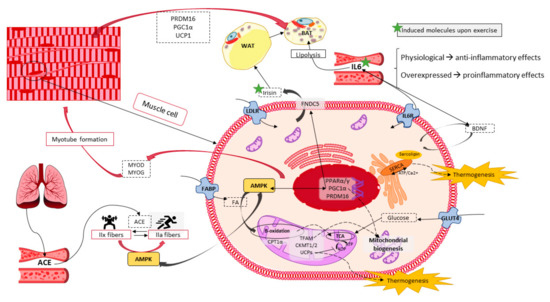 Skeletal muscle -an organ that provides us with physical force- also changes upon exercise training which also provides multiple benefits for human health maintenance and improvement. Therefore, it is not surprising that exercise endurance capacity interferes in the thermogenesic and oxidative capacity within the fibers. Exercise increases sarcolipin to produce a shift in the oxidative capacity of the fibers and hence, enhances thermogenesis. Moreover, exercise can also change the mitochondrial fate upon aging or disease by augmenting its function, oxidative capacity, mitochondrial DNA content and biomass, as well as increasing the expression of several mitochondrial biogenesis related transcription factors such as TFAM and PGC1α [87,88]. Additionally, AMPK and SIRT1 are also activated upon exercise, increasing the systemic insulin sensitivity by their role in the increase of mitochondrial biogenesis, oxidative phosphorylation and density of fibers in the skeletal muscle (Figure 4) [49,89]. Thus, the increase of the non-shivering thermogenesis in skeletal muscle is another strategy for preventing metabolic diseases.
