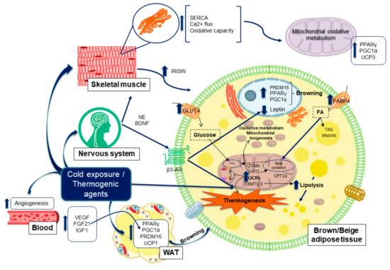 As explained before, BAT and beige cells have the capacity to burn off nutrients upon specific external conditions and therefore to control the energy balance in the body. When mitochondrial electron chain is uncoupled from the ATP final production, the reductive power may be dissipated into heat, a process called thermogenesis [59]. Thus, thermogenesis is the ability to generate heat in the body due to metabolic reactions which, upon correct thermal homeostasis, allows mammals (like humans) to control their body temperature as a static value of approximately 36–37 °C.