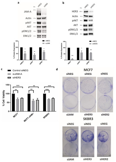 3.1. JAM-A Regulates mRNA and Protein Expression of HER3