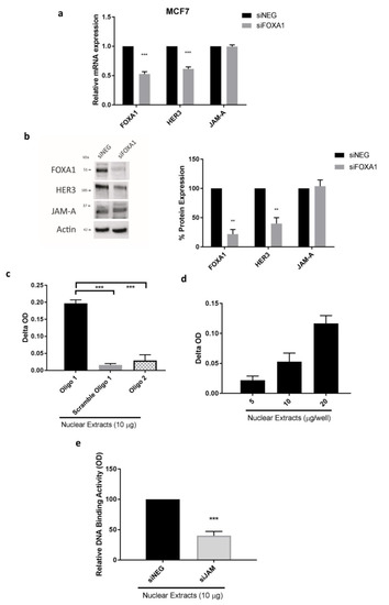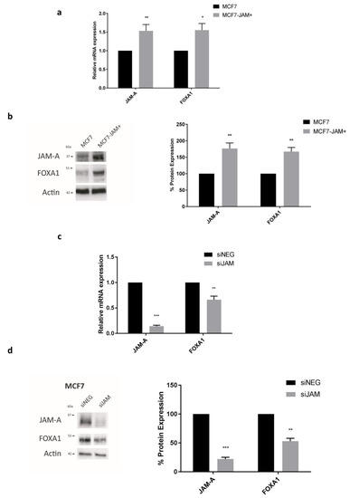 3.3. JAM-A Expression Influences mRNA and Protein Expression of FOXA1