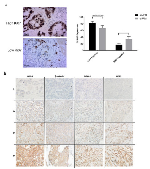 3.6. JAM-A Expression Correlates with Proliferation in a Semi-In Vivo Setting and with β-Catenin Expression in a Patient Tissue Microarray of Invasive Breast Cancer Specimens