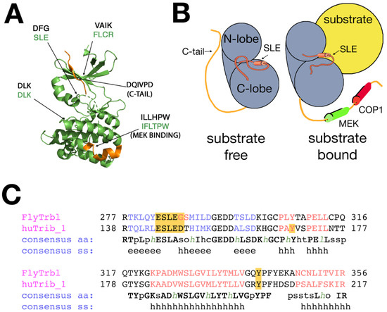 The paradigm of Trib family function. (A) Proposed structure of the Drosophila Trbl kinase-like domain core, based on the structure of Trib1. Kinase/Trib homologies are indicated (aspartic acid–leucine–lysine (DLK)/DLK, aspartic acid–phenylalanine–glycine in kinases (DFG)/SLE and valine–alanine–isoleucine–lysine in kinases (VAIK) is phenylalanine-leucine-cysteine-arginine (FLCR). SLE motif resides in a flexible domain, similar to its mammalian counterpart. Location of the MEK (Mitogen-activated protein kinase kinase) binding site and C-terminal tail (orange) is indicated. (B) Simplified representation of the bi-lobed Trbl pseudokinase structure unbound (right) and bound (left) to substrate (yellow). The C-terminal tail is released upon degron binding and the SLE motif swings from an “in” to “out” configuration [56]. MEK1 and COP1 sites on the tail are indicated. (C) The primary structure of the flexible SLE domain is part of a highly conserved region in the kinase-like domain. The residues in red indicate helical structure, the residues in blue indicate beta sheet structure. SS = secondary structure, h = helical, and e = β-sheet.