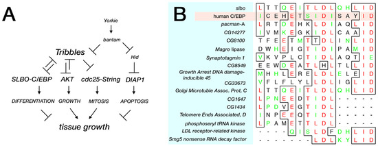 As noted above, the documented roles of Tribs in cancers are inconsonant; they can act as tumor suppressors or oncogenes, depending on the cellular context [8]. While CDC25, C/EBP, and Akt are conserved downstream targets (Figure 3A), how Trbl fits into a comprehensive set of growth regulatory pathways controlling cell proliferation and apoptosis remains unclear. Recent work from the Harrant lab focused on Trbl regulation by the 21 nucleotide microRNA (miRNA) encoded by the bantam gene [114]. The bantam locus of Drosophila was identified almost 20 years ago in a gain-of-function screen for genes that promote Hippo–Yorkie pathway-dependent growth [115], and significantly, in humans Hippo signaling defects are associated with mesotheliomas and cancers of the head and neck and gastrointestinal and gynecologic cancers [116].