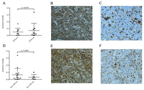 Immunohistochemical expression of HLA class I antigen compound beta2microglobulin was observed to be lost in a substantial subgroup of HGBL DH/TH patients (B,C) yet shows no significant impact on TIL TCR clonality measures, signified by productive clonality. Similar results were observed regarding other clonality measures (A); %top10 clones, max. productive frequency; data not shown). Moreover, while immunohistochemical loss of expression of HLA class II antigen HLA-DR was less prevalent (E,F), again, o significant impact on clonality measured could be observed (D).