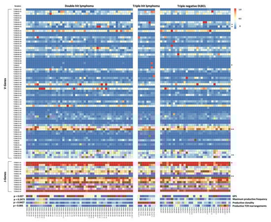 Comparing the diversity of the TCR repertoire and productive TCR rearrangements between HGBL-DH/TH and tnDLBCL, findings from the present study lead to the conclusion that immunotherapy approaches might be more encouraging in tnDLBCL patients []. Concurrently, productive clonality which influences response to immunotherapy differed significantly between HGBL-DH/TH and tnDLBCL (p = 0.0427). Accordingly, a higher diversity of the TCR-repertoire decreases the probability of immunologic tumor antigen escape [].