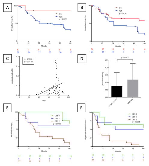 As demonstrated by log-rank testing and Kaplan-Meier analysis both elevation of productive clonality and the percentage of maximum frequency clone as measures of TCR repertoire diversity and tumor-directed activity of the adaptive immune system had significant adverse impact on OS (productive clonality: p = 0.0273; HR: 2.839; CI: 1.124–7.169; maximum productive frequency: p = 0.0307; HR: 2.167; CI: 1.074–4.370) but not PFS (productive clonality: p = 0.4459; maximum productive frequency: p = 0.5567) if dichotomized as described [] (Figure 4A,B, Supplementary Figure S1). Similar to results recently obtained by Simnica et al. we further found these parameters to be a function of age (Figure 4C and Supplementary Figure S1). Intriguingly, these parameters, reflecting the clonal architecture of the tumor-infiltrating TCR repertoire, differ from DLBCL, independently from age (Figure 4D and Supplementary Figure S1) []. Contrastingly, an elevated GPS as an indicator of undirected innate immunological response and inflammation was shown to significantly predict OS and PFS (Figure 4E,F). Subsequent multivariate analysis revealed GPS (p = 0.029) and R-IPI (p = 0.006) to be the only prognosticators holding significant impact for OS while clonality measures were just bordering on statistical significance (p = 0.082 for maximum productive frequency and p = 0.294 for productive clonality). Current data detected a significant higher rate of productive TCR rearrangements in patients with aggressive B-cell lymphomas with a GPS of 0 compared to a GPS of 1 (p = 0.0415) or a GPS of 2 (p = 0.0227) (Supplementary Figure S2).