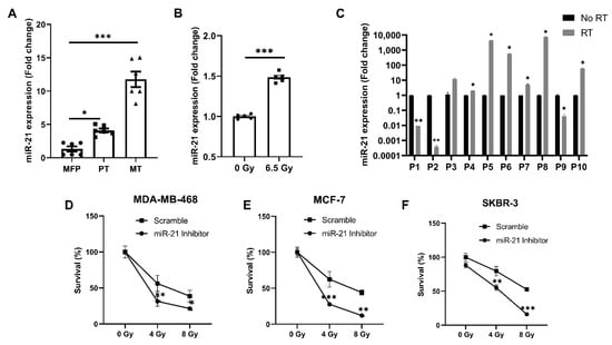 As an increased expression of miR-21 is implicated in the poor prognosis and progression of several types of cancer and treatment resistance, we used an in vivo model for the first time to evaluate this in triple-negative breast cancer. In this 4T1 model, the expression of miR-21 was increased ~4-fold in primary tumors and ~11.8-fold in the metastases compared to normal mammary fat pad tissue (MFP) (Figure 1A). Prior studies have shown miR-21 to play a role in radiation resistance, so primary tumors were also evaluated for miR-21 expression in the presence or absence of radiation [21,22]. Tumors treated with radiation showed a ~1.5-fold increase in miR-21 expression compared to the untreated tumors (Figure 1B). Next, we validated these animal experiments by determining the miR-21 levels in human sera collected from breast cancer patients (n = 10) before or after a six-week course of radiation. We discovered that radiation caused an increase in the circulating levels of miR-21 in the sera of irradiated patients (Figure 1C). As miR-21 increased with the progression of disease, and also increased with radiation in a syngeneic murine model and was noted to be consistently upregulated in patient samples, we wanted to determine if miR-21 knockdown could increase radiation sensitivity in breast cancer cells of all subtypes. miR-21 inhibition caused significant inhibition of tumor growth compared to scramble control in the triple-negative cell line MDA-MB-468 (Figure 1D, p < 0.05), the estrogen-positive MCF-7 line (Figure 1E, p < 0.001) and the Her-2-neu-positive breast cancer cell line SKBR-3 (Figure 1F, p < 0.05). Collectively, these results indicate that miR-21 is associated with breast cancer progression and the stress response evoked by radiation treatment in murine and human models. Importantly, the loss of miR-21 significantly increases radiation sensitivity in in vitro breast cancer models.