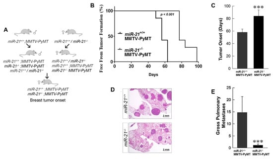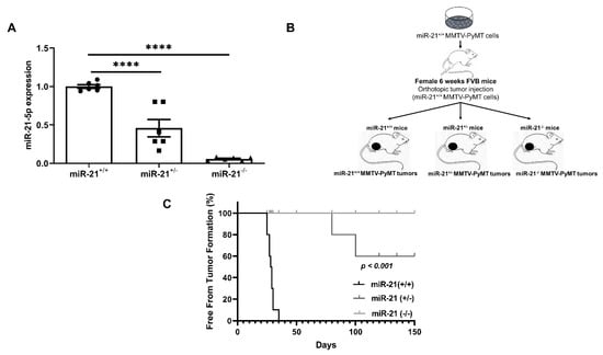 To evaluate if the loss of miR-21 could prevent or slow tumor progression in MMTV-PyMT mice that typically demonstrate rapid tumor formation and progression, we crossed our miR-21−/− and miR-21+/+ mice with the MMTV-PyMT mice (Figure 3A). Notably, the miR-21−/−;MMTV-PyMT mice showed a delayed formation of tumors, with initiation at ~11 weeks compared to the miR-21+/+;MMTV-PyMT mice that developed tumors at ~8 weeks, p < 0.001 (Figure 3B,C).