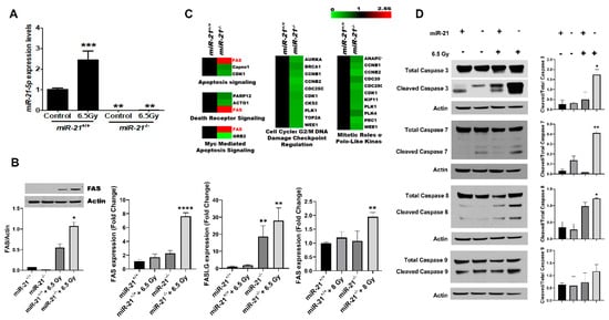 Apoptosis and death receptor signaling pathways contribute to the radiation-sensitive phenotype of the miR-21−/− mice. (A) To investigate the underlying mechanism of radiation sensitivity conferred by loss of miR-21, tumors generated from miR-21−/−;MMTV-PyMT and miR-21+/+;MMTV-PyMT mice were exposed to 6.5 Gy irradiation, and collected after 24 h. Irradiation caused a 2.5-fold induction of miR-21 in the tumors derived from miR-21+/+;MMTV-PyMT mice, whereas no increase was noted in the miR-21−/− tumors determined using one-way ANOVA (***-p < 0.001, **-p < 0.01, n = 3/group). (B) As FAS and FASL are known targets of miR-21, the inverse correlation in the expression of miR-21 and FAS was confirmed transcriptionally and at the protein level for Fas in tumors derived from miR-21−/−;MMTV-PyMT and miR-21+/+;MMTV-PyMT mice exposed or not to 6.5 Gy. MDA-MB-468 cells were transfected with 60 nM miR-21 inhibitor or scramble with or without 8 Gy. miR-21 inhibition combined with 8 Gy radiation increased FAS expression by 95% (p < 0.01) compared to control, and 63% (p < 0.05) compared control tumors treated with 8 Gy. miR-21 inhibition also caused significant increases in the expression of FASLG (p < 0.01) in tumors, and FAS (p < 0.01) in MDA-MB-468 cells treated with 8 Gy and miR-21 inhibitor, determined using one-way ANOVA (****-p < 0.000, **-p < 0.01, *-p < 0.05, n = 3/group). (C) Ingenuity pathway analysis revealed the activation of apoptosis and death receptor signaling pathways as top canonical pathways. (D) Twenty-four hours after radiation, the activation of the caspase 3, 7, 8, and 9 signaling pathways was evaluated in miR-21−/− and miR-21+/+ tumors by western blot and quantified. Significant upregulation of cleaved caspases was noted in the miR-21−/− tumors (n = 3/group). In detail, caspase 3 was increased by 90%, 7 by 80%, 8 by 70% and 9 by 50% (**-p < 0.01, *-p < 0.05. Data represent the difference in means represented as mean ± SEM of three independent mouse tumor tissues normalized to housekeeping genes snoRNA 95, snoRNA96A miRNA, UniSp6, GAPDH mRNA and actin; p < 0.001 or <0.01 as determined by one-way ANOVA with Dunnett’s Post-test.