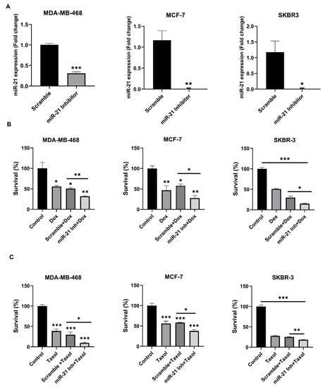 Chemosensitizing effect of miR-21−/− in breast cancer cells. Knockdown of miR-21 by transfecting MDA-MB-468, MCF-7 and SKBR-3 cells with miR-21 inhibitor sensitizes them to chemotherapy drugs; (A) 90 nM miR-21 inhibitor causes a ~70% decrease in miR-21 expression in MDA-MB-468 cells compared to scramble, while 90 nM in MCF-7, and 30 nM in SKBR-3 cells, caused almost complete miR-21 inhibition compared to scramble. (B) At 48 h post-treatment, miR-21 inhibition combined with doxorubicin caused a ~40%, ~50%, and ~50% decrease in cell survival of MDA-MB-468, MCF-7, and SKBR-3, respectively, compared to scramble control. (C) At 48 h post-treatment, miR-21 inhibition combined with taxol caused a ~70%, ~53% and ~28% decrease in the cell survival of MDA-MB-468, MCF-7, and SKBR-3, respectively compared to scramble control. All the in vitro experiments were done in triplicates or quadruplets (n = 3/group), *** p < 0.001 or ** p < 0.01 or * p < 0.05, determined by two-way ANOVA with Bonferroni post-test or student’s t-test.