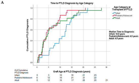 The overall median time from transplant to PTLD diagnosis was 5.5 years (95% confidence interval (CI): 2.9, 8.1). Amongst subgroups, infant transplant recipients showed the longest time to diagnosis at 12.0 years (n = 23) (95% CI: 8.1, 15.9) compared to pediatric/adolescent transplants at 4.0 years (n = 22) (95% CI: 2.1, 5.9) and adult transplants at 4.5 years (n = 21) (95% CI: 2.9, 8.1) (p = 0.125). Cumulative incidence of these diagnoses is shown in Figure 1A. After restricting this analysis to heart transplant recipients, the difference in time to PTLD diagnosis stratified by transplant age approached, but did not reach statistical significance (p = 0.051; Figure S1).