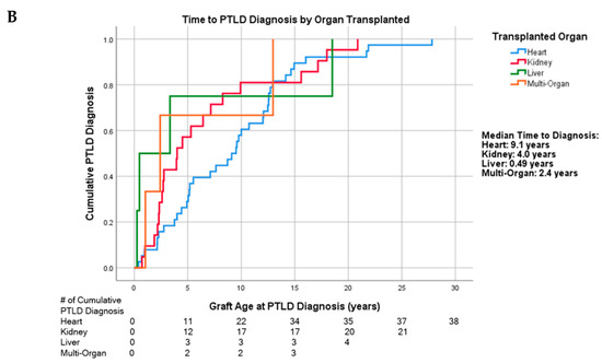 (A). Cumulative PTLD diagnosis categorized by age group. (B). Cumulative PTLD diagnosis categorized by transplanted organ.