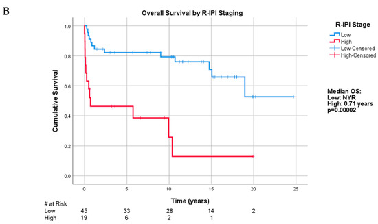 (A). Overall survival in this study population. (B). Overall survival categorized by Revised International Prognostic Index (R-IPI) staging.