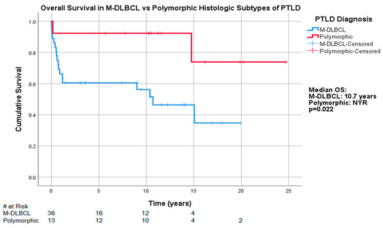 The median OS for those with the M-DLBCL-PTLD subtype was 10.7 years (95% CI: 5.4, 16.0), whereas the median OS was NYR for those with P-PTLD, with 5-year survival rates of 44% (16/36) and 92.3% (n = 12/13), respectively. The OS differences reached statistical significance for that between P-PTLD and M-DLBCL-PTLD (p = 0.022) (Figure 3), but differences between other subtypes did not reach statistical significance. The five-year survival rates of other subtypes in our cohort were as follows: M-BL-PTLD: 100% (n =4/4), HL-PTLD: 100% (n = 3/3), ND-PTLD: 75% (n = 3/4), M-PCN-PTLD: 33% (n = 1/3), T/NK-PTLD: 0% (n = 0/3).