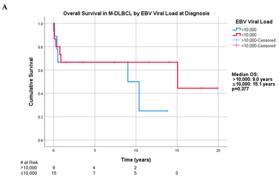 Measurement of whole blood EBV-viral load (VL) at PTLD diagnosis was documented in 56 of 66 patients. Three EBV DNA-positive patients with M-DLBCL-PTLD were missing quantitative EBV-VL. Because the largest subset of patients was those with M-DLBCL-PTLD with 24 positive patients, EBV-VL was examined at 10,000 and 100,000 copies/mL in this subtype. The median pre-treatment EBV-VL in the M-DLBCL-PTLD cohort was 4394 copies/mL, ranging between 21 and 4,063,364. With the 10,000 copies/mL threshold, the median OS for greater than 10,000 copies/mL was 9.0 years (n = 9, (95% CI: 0.35, 17.7)) while OS for less than or equal to 10,000 copies/mL was 15.1 years (n = 15, (95% CI: 0, 39.9)) (p = 0.377) (Figure 4A). The median progression free survival (PFS) of those greater than 10,000 copies/mL was 0.73 years (95% CI: 0.16, 1.31) and less than or equal to 10,000 copies/mL was 10.4 years (95% CI: 0, 29.3) (p = 0.186).