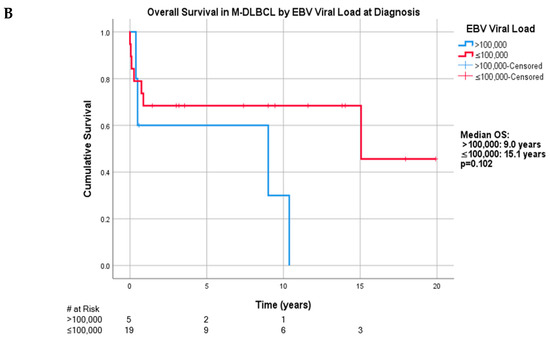 (A) Overall survival in the M-DLBCL-PTLD cohort with reported EBV quantification at the 10,000 copies/mL cutoff. (B) Overall survival in the M-DLBCL-PTLD cohort with reported EBV quantification at the 100,000 copies/mL cutoff.