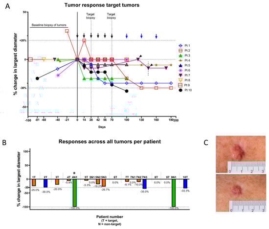 Tumor responses in target tumors. (A) Spiderplot of percent change in largest diameter. Tumor sizes normalized at first vaccination (day 0). Patient #1, #6 and #10 had increasing sizes from diagnostic biopsy until initiation of vaccinations. Arrows indicate vaccination with IO103. Six vaccines were given to all patients, while an additional three vaccines (blue arrows) could be given in patients depending on response. Thus, at day 100, patients 1, 2 and 4 received seventh vaccination and proceeded to receive in total nine vaccines while the remaining patients were evaluated after their sixth vaccination. Patient #7 had a treatment break after the fourth vaccination during which the tumor increased until restart of vaccinations (arrowheads indicate patient #7′s fifth and sixth vaccination). (B) Percent change from baseline in largest diameter for all tumors. *: The non-target tumor on patient #4 was not measured but only photographically documented before clearance after eighth vaccination. (C) Example of PR: target tumor of patient #10. Top: At baseline. Bottom: At evaluation after six vaccinations.