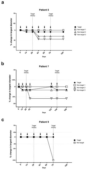 Tumor responses during vaccination with IO103 in patients #5, #7 and #9. Arrows indicate vaccination with IO103. (a) Patient #5, (b) Patient #7, (c) Patient #9.