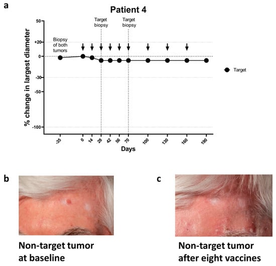 Patient #9 had three sBCCs that were histologically verified prior to initiation of vaccinations. One BCC (largest diameter 12 mm) regressed completely between the day of biopsies and the initiation of vaccinations. The two other BCCs remained at enrollment and initiation vaccinations. The target tumor remained unchanged in largest diameter despite being biopsied after the second vaccination. The remaining non-target BCC regressed completely after the fifth vaccination, 145 days after being biopsied (Figure 2c).