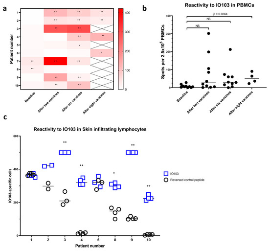 Immune responses. IFN-γ ELISpot reactions against IO103, background subtracted. (a) Immune responses in PBMCs per patient. Spots per 2.5 × 105 in patients #1 to #3 and spots per 3.5 × 105 in patients #4 to #10. *: DFRx1, **: DFRx2 (b) Immune responses in PBMCs per timepoint, samples from patient #4 to #10 have been normalized to spots per 2.5 × 105. For comparisons baseline to after two and after six vaccines, repeated measures ANOVA with Tukey’s multiple comparisons test was used, for comparison of baseline to after eight vaccines, paired t test was used, for both tests p ≤ 0.05 considered significant. (c) Immune responses in skin-infiltrating lymphocytes. SKILs from patient #6 did not grow sufficiently. Patient #7 did not have DTH performed. SKILs tested in IFN-γ ELISpot against IO103 or a scrambled control peptide. SKILs per well: Pt #1: 3.0 × 105, Pt #2: 1.0 × 105, Pt #3: 1.2 × 105, Pt #4: 2.85 × 105, Pt #5: 1.7 × 105, Pt #8: 2.0 × 105, Pt #9: 2.25 × 105, Pt #10: 2.6 × 105. *: DFRx1, **: DFRx2. SKILs from patient #2 were tested in duplicate, a Student’s t test p = 0.11. NS = non-significant.