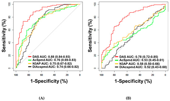 Classification performances of plasma polyamines in the Test Set. (A,B) Area under the curve (AUC) of DAS for delineating all cases (n = 116) from healthy controls (n = 71) (A) or patients with benign pelvic masses (n = 72) (B).
