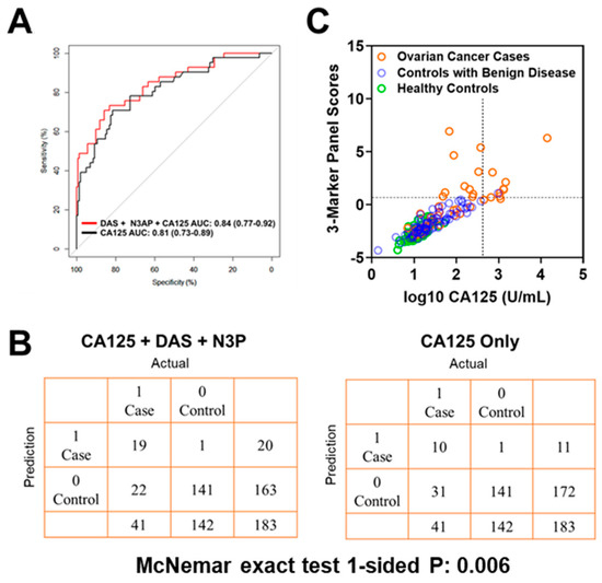 Classification performance of the 3-marker panel and CA125 in the Test Set. (A) Area under the curve for the 3-marker panel consisting of DAS + N3AP + CA125, and CA125 only. (B) Confusion matrix describing the performance of the classification model corresponding to the 3-marker panel and CA125 alone at 99% specificity. Statistical significance was determined by 1-sided McNemar exact test. (C) Scatter plot illustrating the distribution of the 3-marker panel scores (Y-axis) and log10 CA125 values (X-axis). Broken lines represent 99% specificity cutoffs.