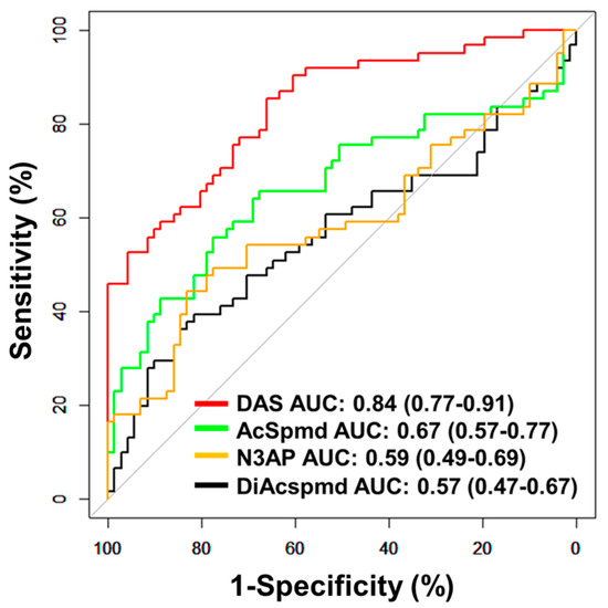 | Diacetylspermine | 0.78 | 0.72–0.85 | <0.001 | 28.4 | 34.7 | 0.70 | 0.60–0.81 | < 0.001 | 24.4 | 22.2 | 0.83 | 0.76–0.89 | <0.001 | 30.7 | 56.9 |