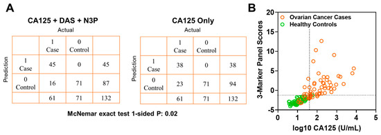 Classification performance of the 3-marker panel and CA125 in the validation set. (A) Confusion matrix describing the performance of the classification model corresponding to the 3-marker panel and CA125 alone at 99% specificity. Statistical significance was determined by 1-sided McNemar exact test. (B) Scatter plot illustrating the distribution of the 3-marker panel scores (Y-axis) and log10 CA125 values (X-axis). Broken lines represent >99% specificity cutoffs.