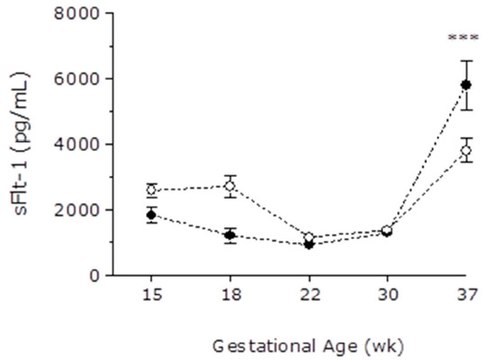 Maternal plasma concentrations of soluble fms-like tyrosine kinase (sFlt-1) in the control group (white points) and pregnant women affected by breast cancer (black points). Differences were analyzed by two-way analysis of variance. Data are presented as mean with standard error mean (SEM). ***, p < 0.001.