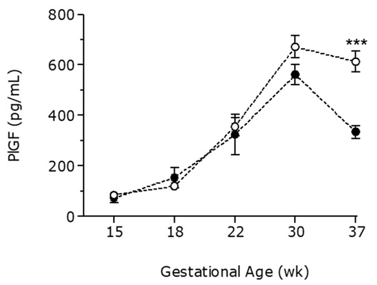 Maternal plasma concentrations of placental growth factor (PlGF) in the control group (white points) and pregnant women affected by breast cancer (black points). Differences were analyzed by two-way analysis of variance. Data are presented as mean with SEM. ***, p < 0.001.