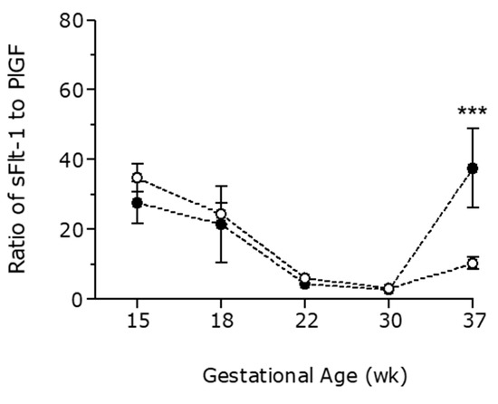 Ratio of sFlt-1 to PlGF in the control group (white points) and pregnant women affected by breast cancer (black points). Differences were analyzed by two-way analysis of variance. Data are presented as mean with SEM. ***, p < 0.001.