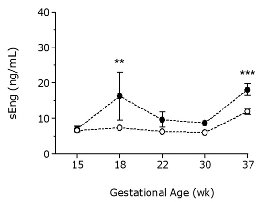 Maternal plasma concentrations of soluble endogline (sEng) in the control group (white points) and pregnant women affected by breast cancer (black points). Differences were analyzed by two-way analysis of variance. Data are presented as mean with SEM. **, p < 0.01; ***, p < 0.001.