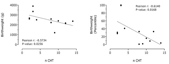 Correlation between cycles of chemotherapy administered (n CHT) and birth weight or percentile in pregnant women affected by breast cancer (n = 12).