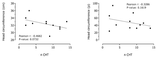 Correlation between number of chemotherapy cycles administered (n CHT) and neonate head circumference or percentile in pregnant women affected by breast cancer (n = 12).