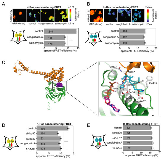 Conglobatin A selectively targets K-Ras via the inhibition of Hsp90/Cdc37. (A,B) FLIM-FRET images of HEK cells transfected with FRET-pairs of mGFP-/mCherry-K-RasG12V (A, top) or mGFP-/mCherry-H-RasG12V (B, top). The labelling indicates donor-only control or treatments. A decrease in the fluorescence lifetime indicates an increase in FRET due to nanoclustering. The transfected cells were treated with 0.1% DMSO vehicle control, 2 μM conglobatin A, or 1.3 μM salinomycin for 24 h. The nanoclustering-FRET analysis by treatment for K-RasG12V (A, bottom) or H-RasG12V (B, bottom). The numbers in the bars indicate the number of analyzed cells; n = 3 independent biological repeats. (C) Conglobatin A (purple surface) was docked into the crystal structure of human N-Hsp90 (green; PDB ID 3T0Z). The docked complex was overlaid on top of the crystal structure of yeast N-Hsp90 in a complex with human Cdc37 (PDB ID 1US7), of which only Cdc37 is depicted (orange). The magnification shows the details of how conglobatin A (cyan sticks) sterically blocks and disturbs critical interactions, notably between Glu47 of Hsp90 (gray sticks) and Arg167 of Cdc37 (orange sticks) at the interface of the complex. ATP is shown as magenta sticks, and magnesium is shown as a deep purple sphere. The polar interactions between conglobatin A and Hsp90 are shown as dashed lines, with distances in Ångströms. (D,E) The K-RasG12V- (D) and H-RasG12V- (E) nanoclustering-FRET in HEK cells co-transfected with mGFP- and mCherry-tagged RasG12V, together with 50 nM siRNA Hsp90, siRNA Cdc37, or 50 nM scrambled siRNA for compound/vehicle (control) treated samples. The next day, the cells were treated for 24 h with 0.1% DMSO vehicle control, 2 μM conglobatin A, or 2 μM 17-AAG. The numbers in the bars indicate the number of analyzed cells. The number of independent biological repeats n = 3 for K-Ras and n = 1 for H-Ras. **** p < 0.0001.