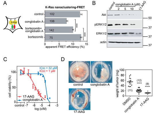 Conglobatin A inhibits Ras signaling, and cell- and microtumor-growth. (A) K-RasG12V nanoclustering-FRET in HEK cells co-transfected with mGFP- and mCherry-tagged K-RasG12V. The cells were pretreated with the DMSO vehicle control or 1 μM bortezomib for 2 h. Then, media containing conglobatin A or the vehicle control were added to the cells, to a final concentration of 2 μM or 0.1% DMSO, respectively. The cells were fixed after 24 h of this treatment. The numbers in the bars indicate the number of analyzed cells; n = 3 independent biological repeats. (B) Western blots of MDA-MB-231 cells that were treated with either 0.1% DMSO vehicle control or with the indicated concentrations of conglobatin A. In total, 2 μM 17-AAG served as the positive control. All of the drug treatments were for 24 h; n = 2 independent biological repeats. (C) 2D cell proliferation dose response curve of conglobatin A or 17-AAG, tested on MDA-MB-231 cells for 72 h; n = 2 independent biological repeats. (D) Microtumor formation of MDA-MB-231 cells on chicken CAM. The cells were treated with 0.1% DMSO vehicle control, 10 μM conglobatin A or 5 μM 17-AAG for 5 days; n = 3 independent biological repeats. **** p < 0.0001.