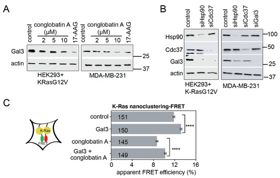 It is well-established that expression of the nanocluster-scaffold galectin-3 (Gal3) selectively increases K-RasG12V-, but not H-RasG12V-nanoclustering [38]. We therefore tested whether the abundance of Gal3 could explain the K-Ras selectivity of conglobatin A. Indeed, conglobatin A dose-dependently reduced the Gal3 levels in K-RasG12V-transfected HEK and MDA-MB-231 cells (Figure 3A). Consistently, the knockdown of Hsp90 or Cdc37 in these cells significantly depleted the Gal3 levels (Figure 3B). Because Gal3 is not known as a client of Hsp90, an upstream transcriptional regulator of Gal3 and a client of Hsp90 were likely to be affected by Hsp90 inhibition. In agreement with such an indirect, transcriptional effect of Hsp90 inhibition on Gal3 levels, the overexpression of Gal3 partially rescued the conglobatin A mediated loss of K-RasG12V nanoclustering (Figure 3C).