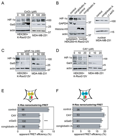 Gal3 is induced by hypoxia, a condition suggested to support the emergence of cancer stem cell properties [41]. Specifically, HIF-1α, the master transcriptional regulator of the hypoxic response and a client of Hsp90 [42,43], is required for the induction and direct regulation of Gal3 expression [41,44]. Treatment with CoCl2, which mimics hypoxia [45], increased the HIF-1α levels and, concomitantly, Gal3 expression in K-RasG12V-transfected HEK and MDA-MB-231 cells (Figure 4A). Note that multiple HIF-1α-positive protein bands can be detected due to post-translational modifications, such as ubiquitination [46]. Conversely, the conglobatin A treatment, similarly to the 17-AAG treatment, decreased the nuclear levels of HIF-1α in these cells (Figure 4B). Moreover, the knockdown of HIF-1α (Figure 4C) or inhibition of HIF-1α transcriptional activity with CAY10585 (Figure 4D) decreased the Gal3 levels. In agreement with this, the inhibition of HIF-1α by CAY10585 selectively decreased K-RasG12V-, but not H-RasG12V nanoclustering-FRET to the same extent as the Gal3 knockdown or conglobatin A treatment (Figure 4E,F).