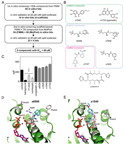 Given the exceptionally low toxicity of conglobatin A compared to ATP-competitive Hsp90 inhibitors [19], the inhibition of the Hsp90/Cdc37 protein–protein interaction may represent a promising alternative strategy for future Hsp90 inhibitor development. We therefore computationally screened a library of >120,000 compounds from the Institute for Molecular Medicine Finland (FIMM), using a conglobatin A-based pharmacophore model and molecular docking (Figure 5A). Subsequently, the in silico hits were tested in vitro using the mammalian cell lysate-based split Renilla luciferase assay, which can distinguish Hsp90/Cdc37 interaction inhibitors from ATP-pocket competitors [25] (Figures S1C and S2A). This first in vitro validation led to the identification of four scaffolds (Figure S2B), which were used for a second round of in silico screening of the FIMM and approximately 7 M compounds comprising the MolPort compound libraries (a total of 112 in silico hits, 41 of which are available for repurchasing and in vitro testing) (Figure 5A; Data S1). After the in vitro validation, we identified nine compounds from three chemical scaffolds that significantly inhibited the interaction of the full length Hsp90 with Cdc37 at IC50 < 60 μM in the split Renilla luciferase assay (Data S1). We then immediately excluded large polyphenols, given their potential toxicity. The remaining six compounds were then confirmed to also inhibit the interaction of the N-terminal Hsp90 fragment with Cdc37, suggesting that they are true inhibitors of the intended interface (Figure 5B; Table 1; Figure S2C–F). Furthermore, all of the compounds had drug-like characteristics based on Lipinski’s rule of five, and showed no structural resemblance to conglobatin A. Notably, the most active compound ×6506 had IC50 = 4.1 ± 0.4 μM, an almost fivefold greater potency than conglobatin A.