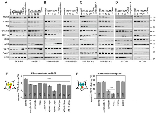 Top compounds decrease the expression of Hsp90 clients, and dose-dependently inhibit K-Ras nanoclustering-FRET. (A–D) Western blots of HER-2 overexpressing SK-BR-3 (A), KRAS mutant triple negative breast MDA-MB-231 (B), KRAS mutant pancreatic MIA PaCa-2 (C), and KRAS mutant lung HCC-44 (D) cancer cell lines. The cells were treated with 0.1% DMSO vehicle control or the indicated concentration of compounds. In total, 2 μM 17-AAG or 10 μM conglobatin A served as the positive control. Note the increase in Hsp90 and, in particular, Hsp70 with the 17-AAG treatment, which was not observed with interface inhibitors. All of the drug treatments were for 24 h; n = 1 independent biological repeat. (E,F) K-RasG12V- (E) and HRasG12V- (F) nanoclustering-FRET in HEK cells co-transfected with mGFP- and mCherry-tagged RasG12V. The cells were treated for 24 h with 0.1% DMSO vehicle control, 2 μM conglobatin A, 2 μM compactin, 0.5 μM FTI277, or the indicated concentrations of ×6505 or ×1540 (E) or 5 μM of these hit compounds (F). Compactin and FTI277 block Ras prenylation and farnesylation, respectively, and served as positive controls. The numbers in the bars indicate the number of analyzed cells; n = 3 independent biological repeats. **** p < 0.0001.
