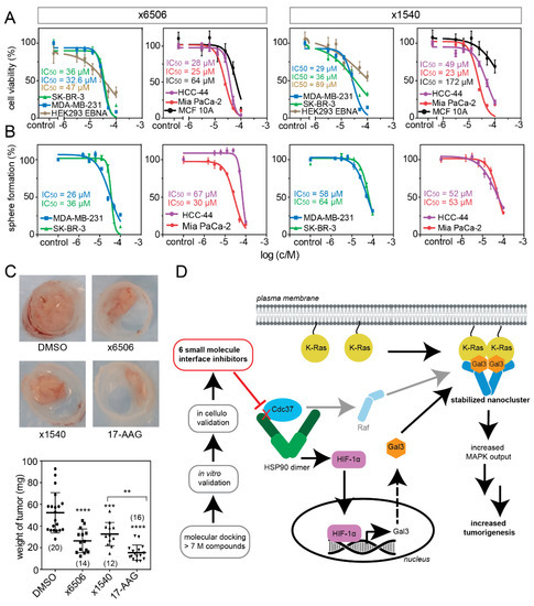 Top compounds inhibit 2D and 3D cancer cell growth and microtumor formation in the CAM model. (A) Compounds ×6506 or ×1540 dose-dependently reduced the 2D proliferation of several cancer and non-transformed cell lines after 72 h; n = 3 independent biological repeats. (B) Compounds ×6506 or ×1540 dose-dependently reduced the 3D spheroid growth of several cancer cell lines cultured under low attachment and serum-free conditions after 72 h; n = 3 independent biological repeats. (C) Microtumor formation of MDA-MB-231 cells on chick embryo CAM. The cells were treated with 0.1% DMSO vehicle control, 20 μM ×6506 or ×1540, or 10 μM 17-AAG for 5 days; n = 2 independent biological repeats. The number of analyzed microtumors per condition is given in brackets in the plot. (D) Summary scheme showing, on the left, the compound screening success, leading to six new small molecule Hsp90/Cdc37 protein interface inhibitors that could serve as a starting point for drug development. The major part on the right illustrates how Hsp90 activity is linked to the K-Ras signaling output via HIF-1α and Gal3, which can stabilize the K-Ras nanocluster and thus increase the MAPK-output. According to our nanocluster model, Raf proteins are integral components; hence, we here indicate a potential mechanistic contribution via Raf. However, it is currently unknown which Raf-dimers preferentially stabilize the K-Ras nanocluster. ** p < 0.005, *** p < 0.001, **** p < 0.0001.